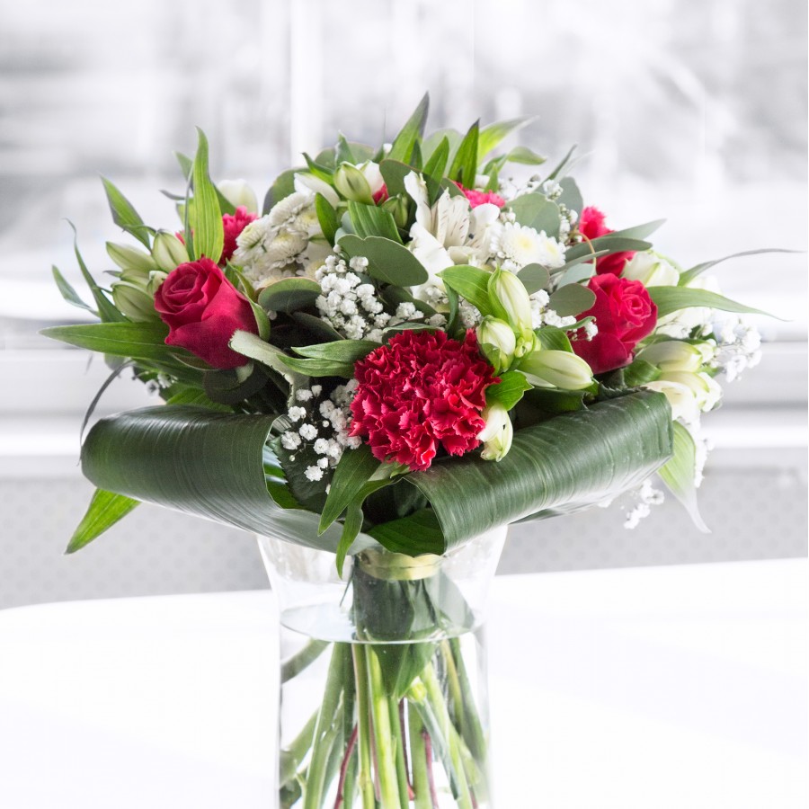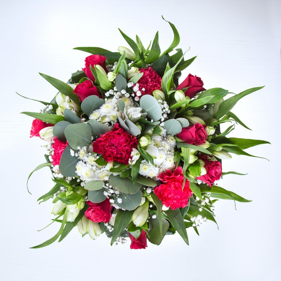 Introducing the Pure Elegance Bouquet, a symbol of beauty and sophistication. This exquisite arrangement combines the pristine white of chrysanthemums and gypsophila with the passionate hues of red roses and carnations, all seamlessly arranged with white alstroemeria and aspidistra leaves to create a captivating display.