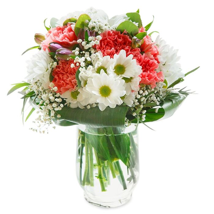 There's a tender exuberance to this bouquet-corals and reds harmonizing in the ruffled embrace of carnations, white daisies gleaming in joyful contrast, and airy gypsophila drifting delicately throughout. Set within a pristine white gift bag, the arrangement feels freshly gathered from Friern Barnet's springtime avenues, carrying the crisp scent of early blooms and cut green leaves. Wisps of unopened, purple-blushed buds lend an air of quiet mystery, tucked to the side like secrets revealed at twilight. The whole ensemble is lovingly cradled by smooth, glossy foliage, which not only frames the flowers but heightens the impression of fullness and vitality. Light springs across the flowers, highlighting every fold and hue, while the gift bag's sturdy ribbon handles promise safe passage on its journey-perhaps to mark a birthday along Woodhouse Road or to welcome a new home near Friary Park. Crafted with care by florists deeply rooted in the Friern Barnet community, this bouquet radiates sincerity and the hope of meaningful connections with every delivery. This exuberant bouquet, arranged with artistry for Friern Barnet's discerning flower lovers, glows with optimism and care. Luminous white daisies-each centered in a cushion of lime green-radiate across a field of ruffled coral-pink carnations, their textures and colours gently blending like the hues of sunset over Friary Park. Wispy baby's breath shimmers throughout, its tiny, snowy flowers creating a sense of movement and lightness. Slender hints of alstroemeria buds, their petals edged in pink and lavender, are tucked discreetly among the fresh eucalyptus and glossy dark foliage, echoing the area's diverse gardens. The bouquet's rounded, full form conjures feelings of comfort and completeness, speaking to the expert touch of local Friern Barnet florists. It conveys emotion-offering a spirited tribute for birthdays, expressions of appreciation, or heartfelt congratulations to neighbours and friends in N11. Its palette and scent recall the renewed promise of spring, the air fresh with greenery and gentle blossoms. Impeccably presented against a pristine backdrop, this bouquet truly transforms any home or celebration across Friern Barnet, capturing both the joy of floral artistry and the welcoming spirit of the community. Brimming with colour and crafted with an eye for both artistry and local spirit, this bouquet gathers together coral-pink carnations, crisp white daisies, chrysanthemums, and delicate sprays of baby's breath. The lush, soft carnation petals offer a vibrant focal point, their hues reminiscent of early mornings in Friern Barnet when sunlight filters over Woodhouse Road. Snowy daisies with bright yellow-green eyes punctuate the arrangement with youthful brightness, while clusters of multi-petaled white chrysanthemums add depth and grace. Wispy clouds of Gypsophila lend a gentle, airy texture throughout, giving the bouquet its cloudlike softness. Hints of closed magenta alstroemeria buds introduce a splash of mystery and promise, peeking from behind broad glossy green leaves and slender, winding foliage that cradle the entire design. Housed in a simple glass vase filled with clear water, the lively, sturdy stems are on full display-capturing the freshness and skillful touch of Friern Barnet florists. Illuminated by pure, even light, every petal and leaf is rendered in crisp detail, the entire bouquet radiating an inviting sense of warmth and sincerity. Perfect for birthdays, housewarmings, or thoughtful gestures for friends and family around N11, this composition instantly brightens any room and uplifts the mood with its easy, genuine elegance.